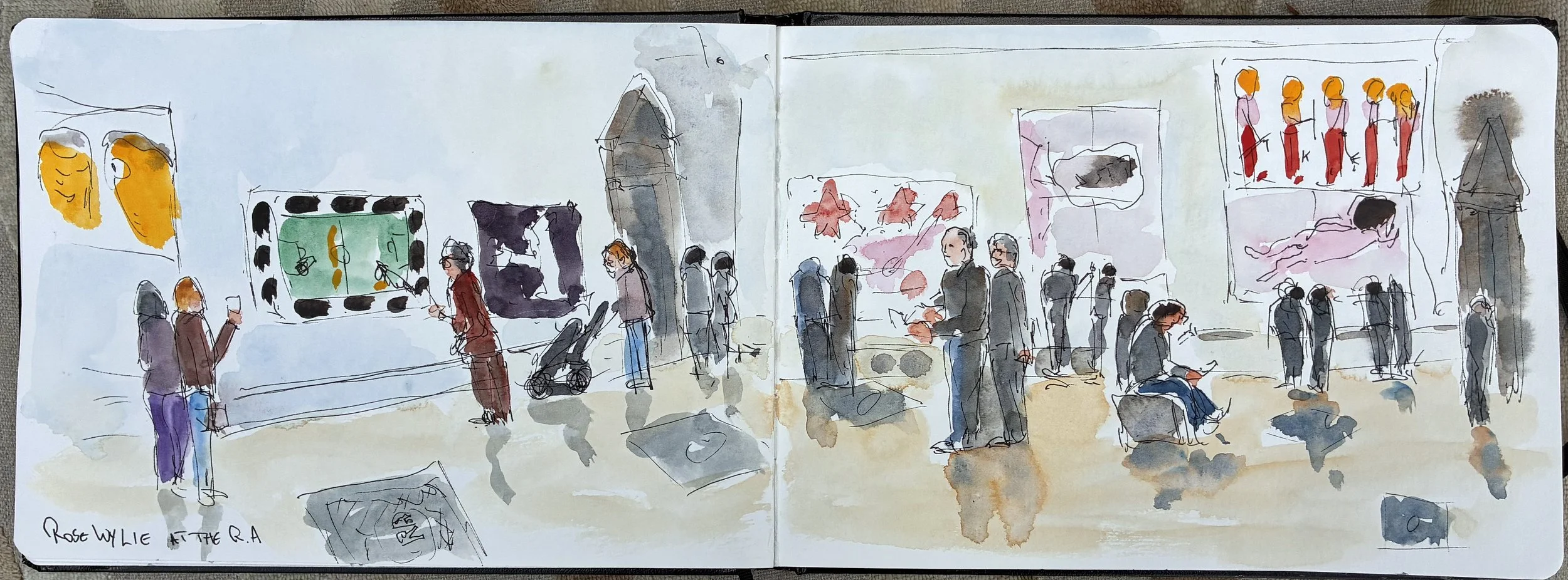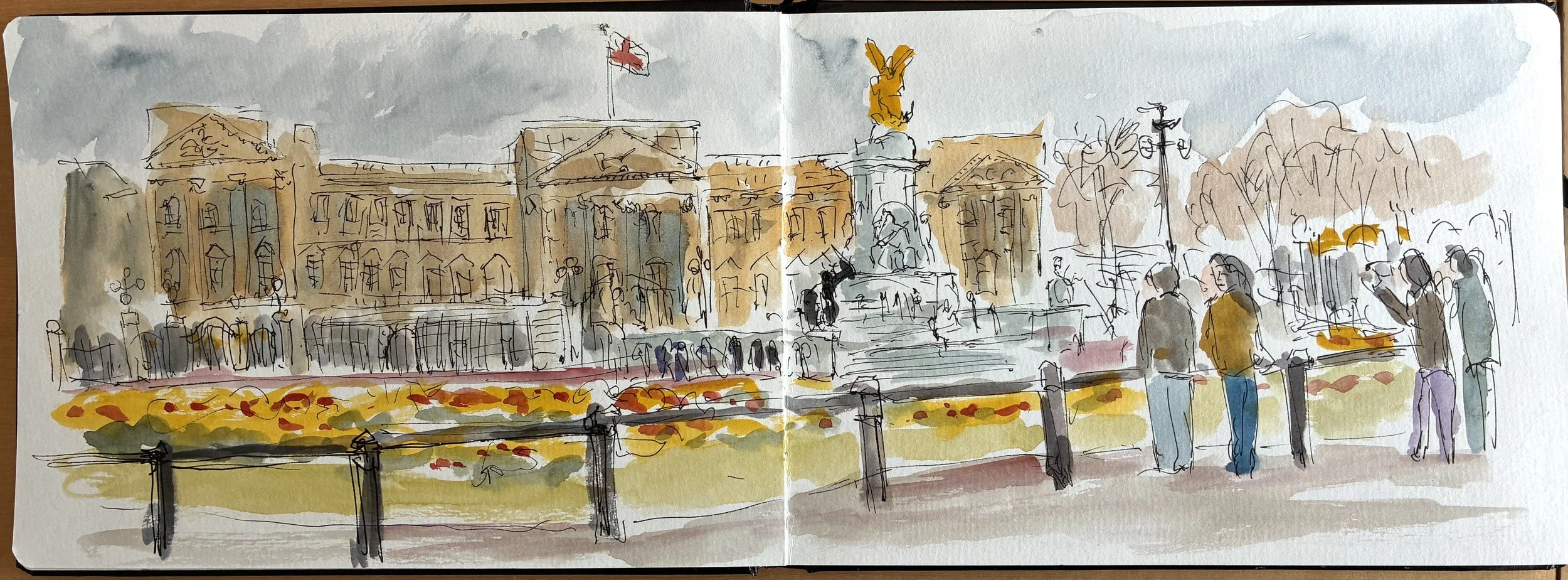 Coach trip to London yesterday with the art club. We visited the Royal Institute of Painters in Watercolour exhibition at the Mall gallery to see some of the finest contemporary watercolour artists. I then wandered up the Mall to sketch Buckingham Palace, the wind was extremely cold so I went to the Royal Academy to warm up and visit the Rose Wylie exhibition. Rose’s paintings are crude, childish and badly painted but there were a couple I would hang on my wall!